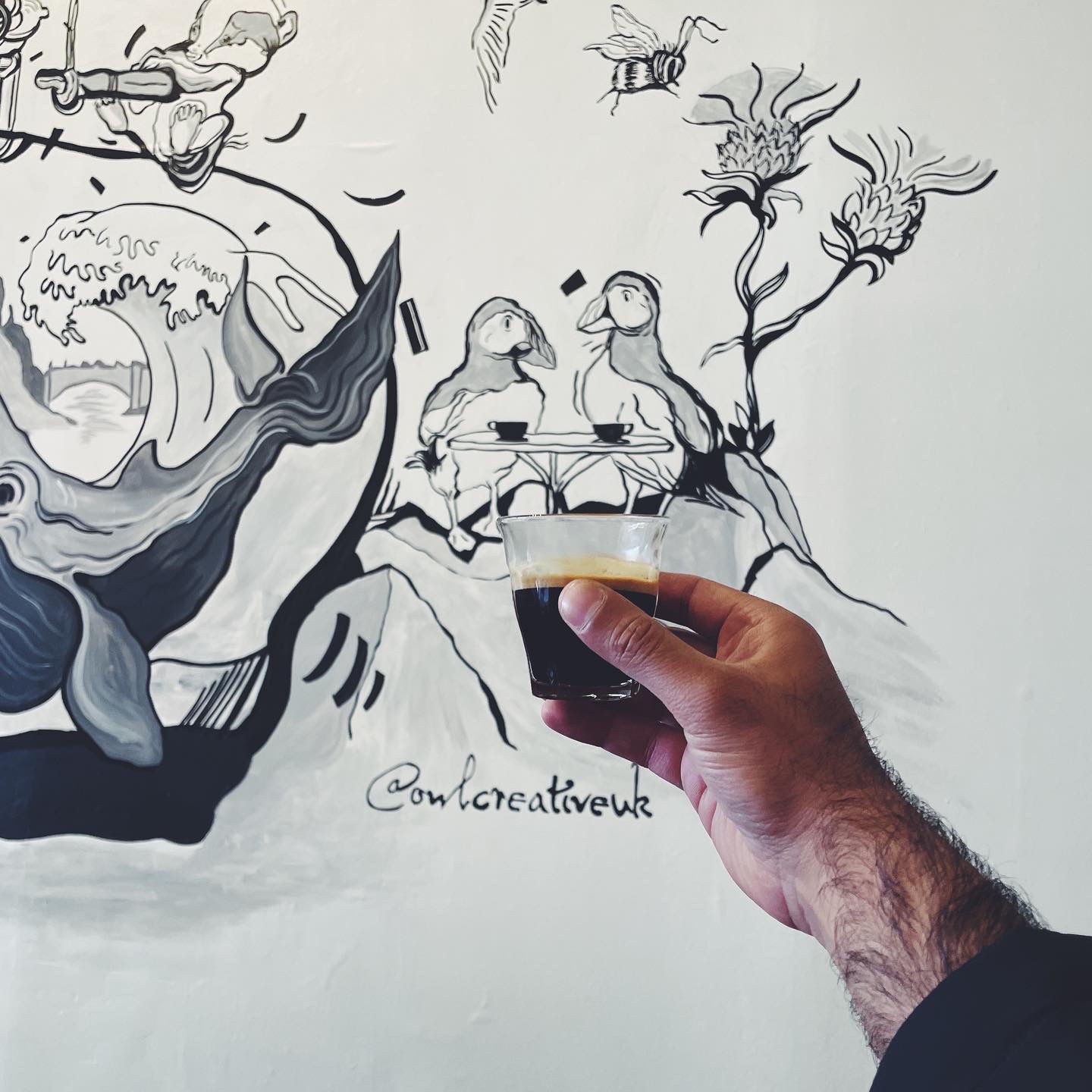 In the heart of West End after a peaceful stroll down William Street you are greeted with a type of cute little coffee house that I adore. A coffee house that is a labour of love for the owner who just loves to make coffee all day long. The feature inside is a lovely piece of artwork on the wall beautifully sketched which you can stare at while sipping away.